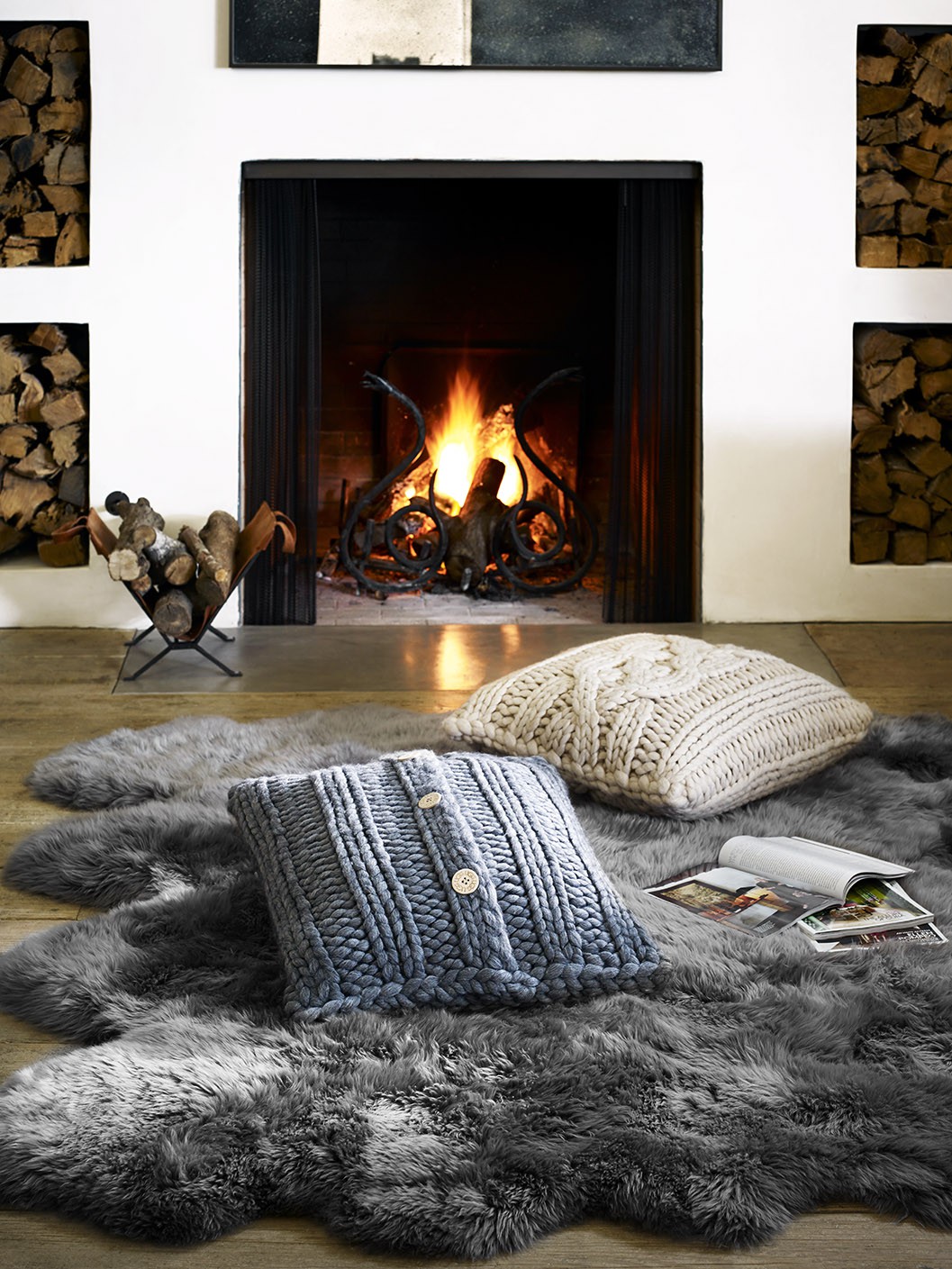 6. Trước lò sưởi của gia đình, hãy thử trải chăn lông ấm áp, kê thêm vài chiếc gối len siêu ấm. Với cách trang trí phòng khách này, cả gia đình bạn có thể cùng nhau nằm trước lò sưởi và trò chuyện với nhau đó nhé!