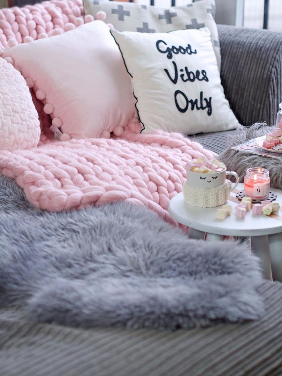 9. Vào những ngày đông vừa mưa buốt và rét lạnh thì cách trang trí phòng khách mùa đông này thật quá đỗi hoàn hảo. Chăn lông, chăn len được bày nhiều trên ghế ngồi trong phòng khách, điểm xuyết là những chiếc gối ôm màu hồng xinh xắn. Thêm một ngọn nến, một chút kẹo ngọt, phòng khách mùa đông của gia đình bạn hiện lên thật ngọt ngào, ấm cúng.