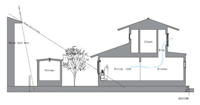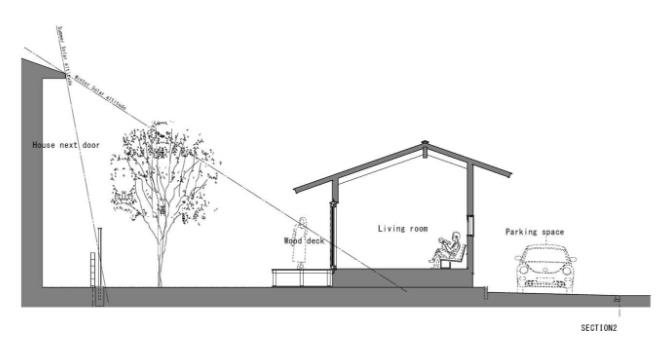 Khác với những ngôi nhà bình thường hướng ra mặt đường, chủ ngôi nhà này lại chọn phương án quay lưng vào bên trong và để một khoảng sân làm nơi để ô tô và lối vào ngôi nhà.