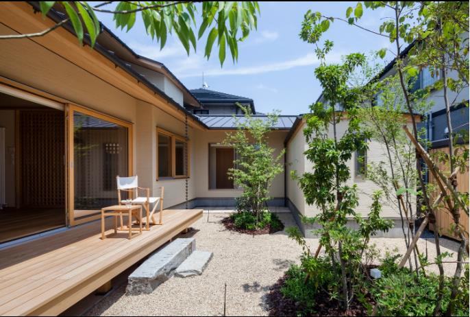 Trái ngược với vẻ ngoài ngôi nhà, không gian bên trong tuyệt đẹp với với khoảng sân rộng rải sỏi và trồng nhiều cây xanh, một hiên nhà lý tưởng và các không gian chức năng vô cùng thoáng mát.