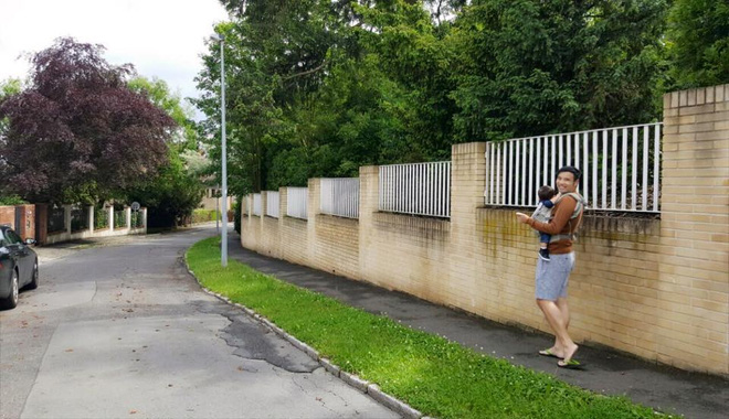 Lối vào căn biệt thự nhà Thu Minh tại Séc. Trong hình, người em thân thiết của Thu Minh đang bế con trai cô dạo chơi.