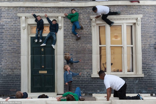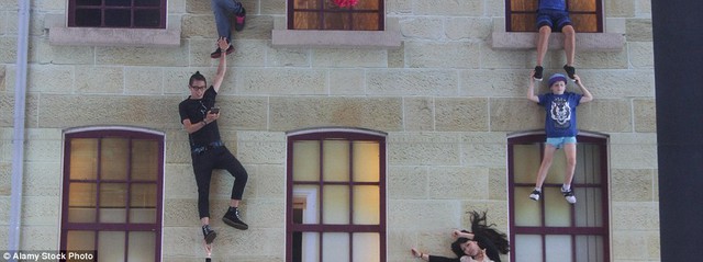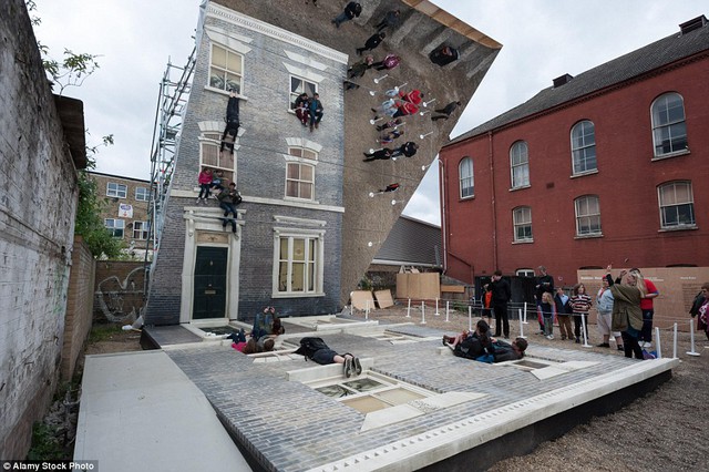 Mới nhìn có cảm giác như mọi người đang leo trèo lên các cửa sổ của ngôi nhà. Nhưng thực ra, họ chỉ đang ngồi hay nằm trên mặt phẳng nằm ngang phỏng theo mặt tiền của ngôi nhà.