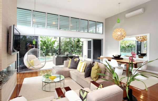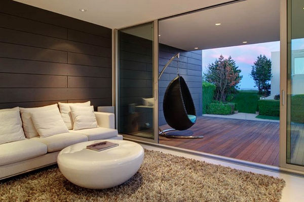 Chiếc ghế treo đặt ngay trước cửa phòng khách tạo không gian hiện đại tiện nghi và không kém phần sang trọng.
