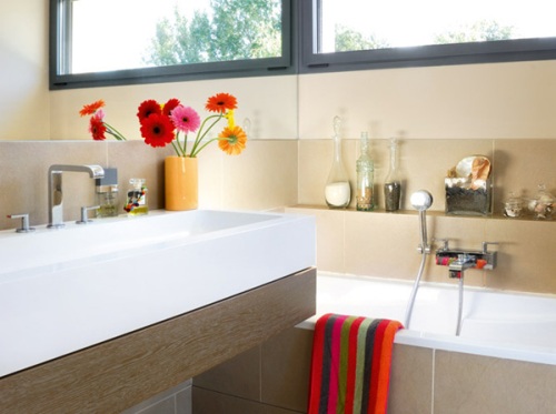 Để căn phòng tắm nhạt nhòa của mình trở nên nổi bật hơn với sắc đỏ, hãy sử dụng đến các điểm nhấn trang trí màu đỏ. Không cầu kỳ như việc sơn tường hay những món nội thất cồng kềnh, điểm nhấn ở đây có thể chỉ là bức tranh, đồ trang trí như bình hoa, đề can trang trí tường.