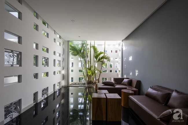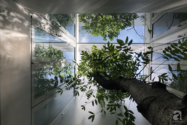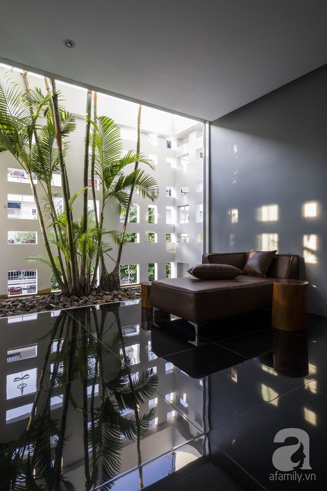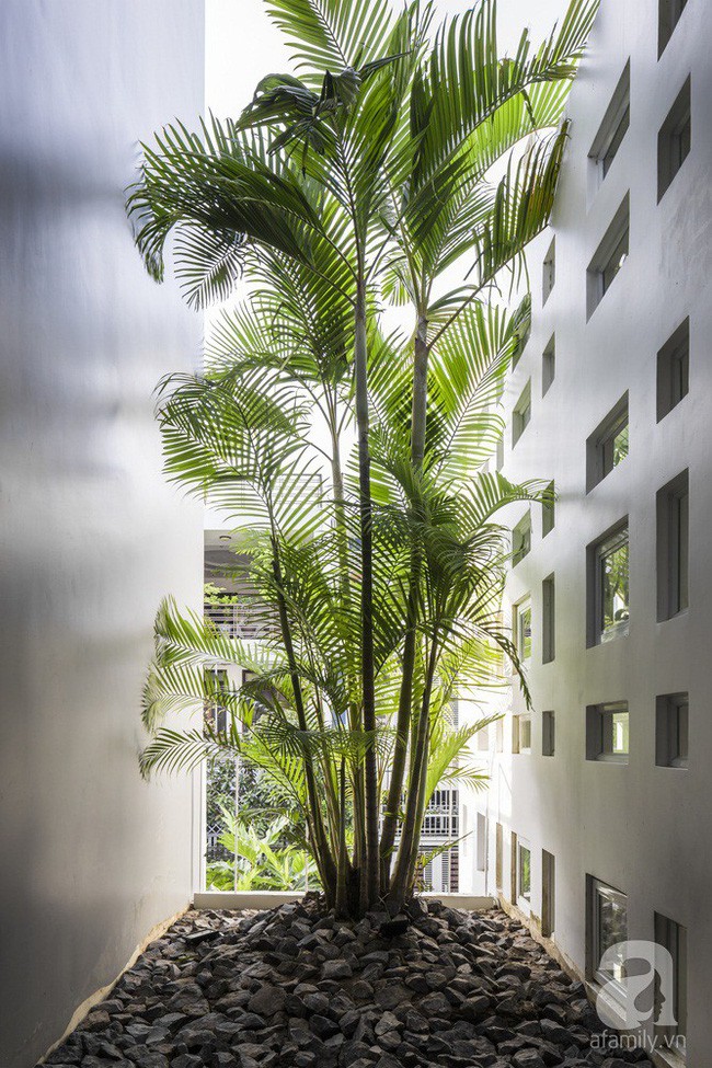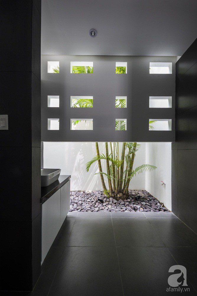 Ngôi nhà có giếng trời ở giữa, giúp các không gian vệ tinh xung quanh có đủ đầy ánh sáng và gió mát. Bên cạnh đó, những ô cửa nhỏ giúp ánh nắng khi vào nhà được giảm bớt nhiệt nhưng vẫn đảm bảo đủ độ sáng. Bên cạnh đó, ngôi nhà được xây trừ một phần đất phía trước, phía sau, bên hông để trồng cây tạo sự cân bằng cho cuộc sống của mọi người trong nhà.