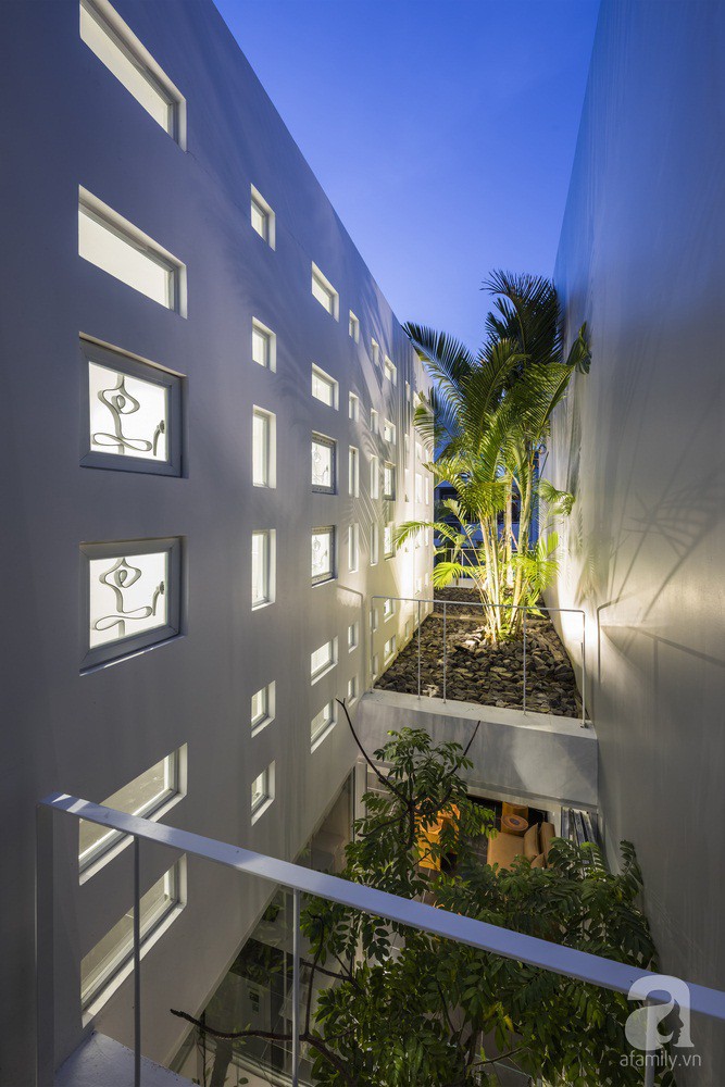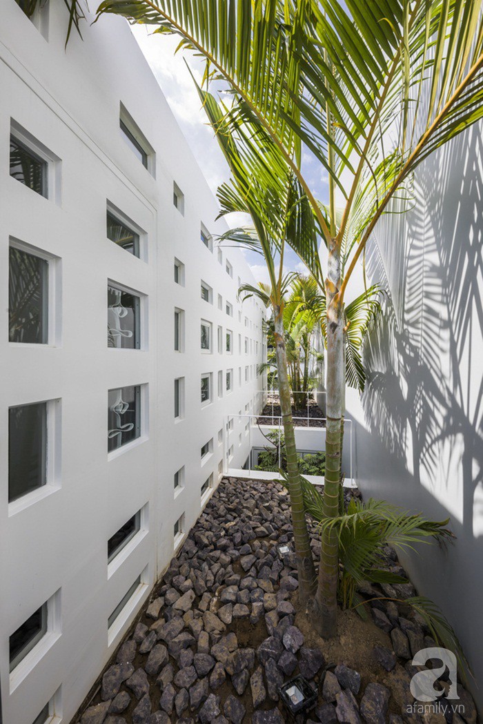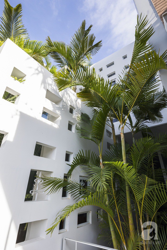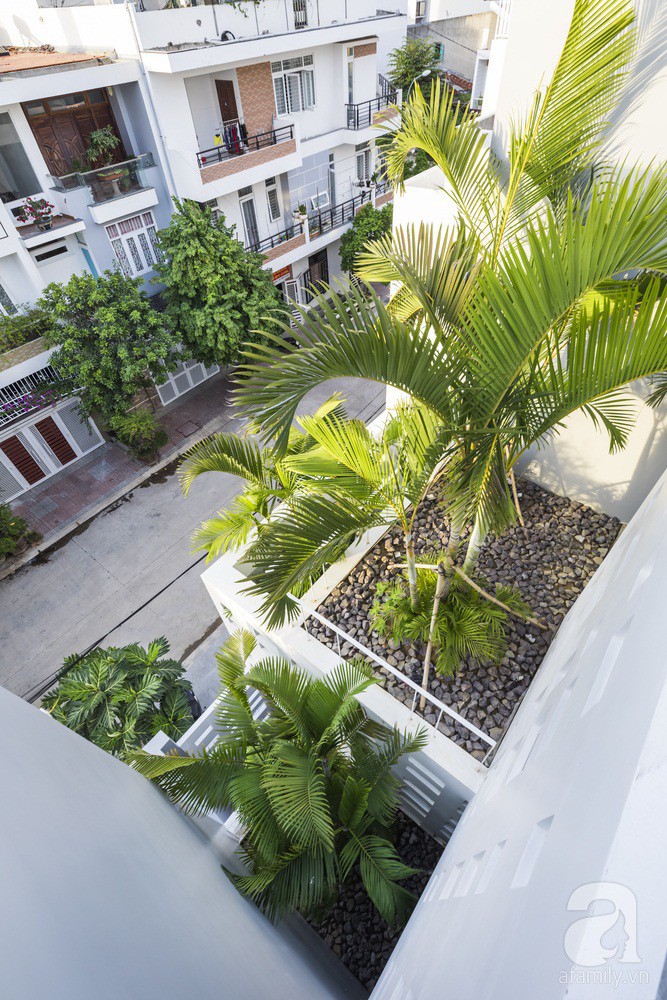 Nhìn từ bên ngoài, ngôi nhà đã tạo được nét thiện cảm đặc biệt với mọi người nhờ cách thiết kế các ô cửa nhiều kích thước khác nhau trên nền tường trắng giản dị nhưng cũng vô cùng nổi bật. Xen kẽ những góc kiến trúc hiện đại là nét gần gũi, bình dị được lấp đầy bởi cây xanh, bởi thiên nhiên.