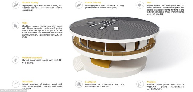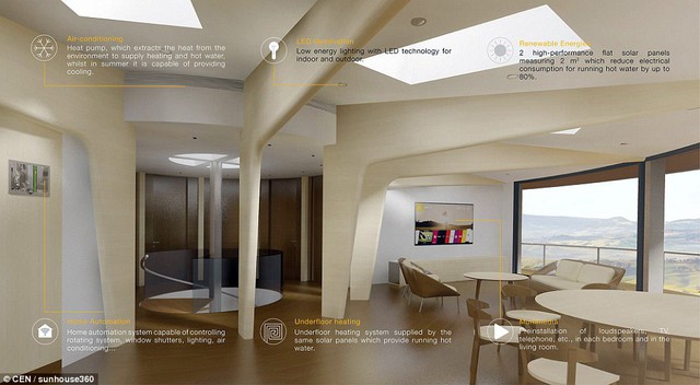 Với thiết kế độc đáo, ngôi nhà có khả năng tự xoay 360 độ nhờ đó có thể đón nhận ánh sáng mặt trời suốt cả ngày. Chi phí xây dựng ngôi nhà độc đáo này rơi vào khoảng 540.000 bảng Anh với diện tích 250m2, tất cả các mặt tròn hướng tầm nhìn đến toàn cảnh.